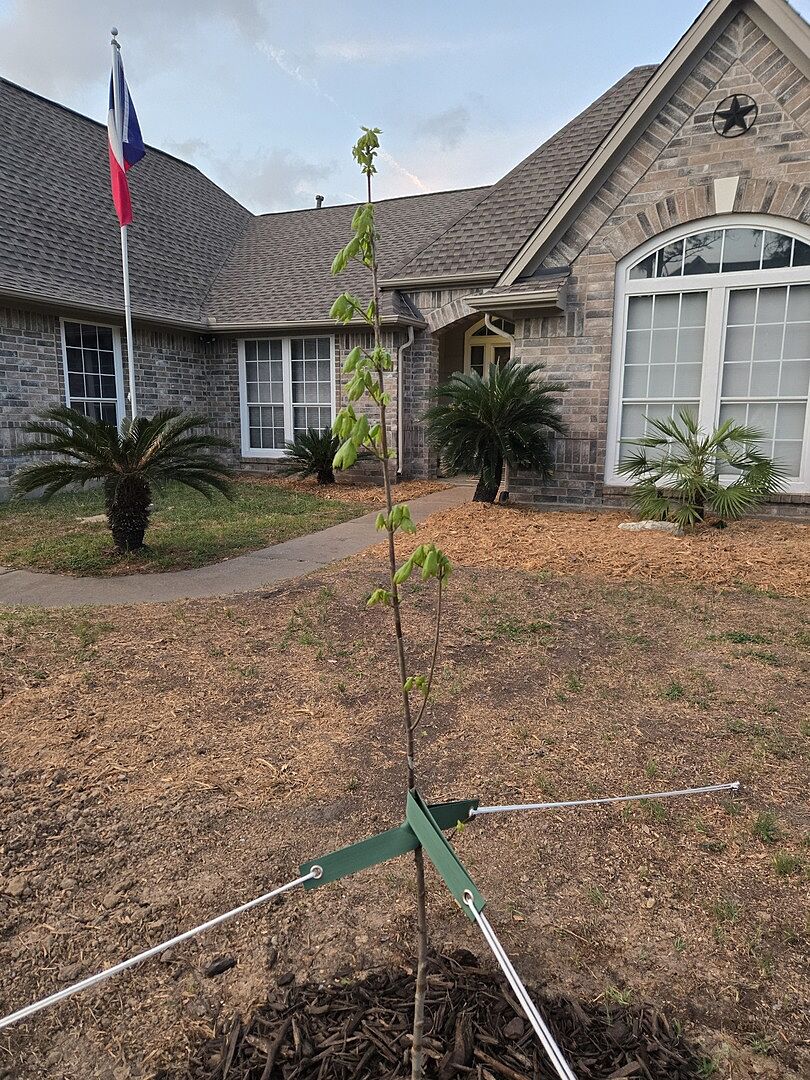 When my tree arrived, it looked more like a stick. After a couple days in the ground it is starting to leaf. One of the main branches had been pruned off which makes it look awkward. Hopefully it will branch out as it matures.