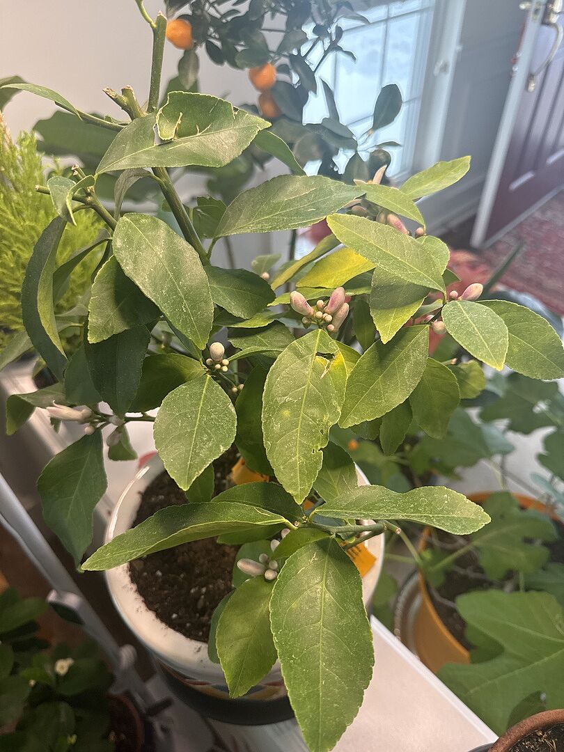 Impressed by how sturdy this little bush is. Thick stalks and many blossoms. Going well no leaf or blossom loss. I expect fruit this year.